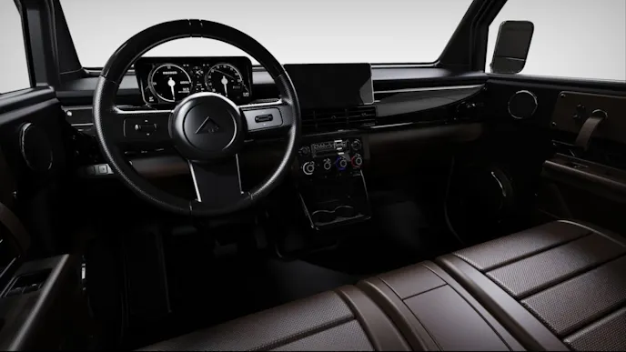 Inside, the four-door SUPERREX blends functionality with comfort. The vehicle offers a spacious interior with seating for five passengers. For added versatility, the rear seats are foldable and removable, providing extra cargo space. With the rear seats removed, there’s 43.3 cubic feet of cargo space. Additionally, the SUV includes a digital display for the driver, a wide format center display, and optional haptic controls. It also boasts ample storage, with compartments located under the hood and in the rear hatch. Finally, the SUPERREX interior offers premium seat and trim material, Bluetooth connectivity, and a premium sound system.