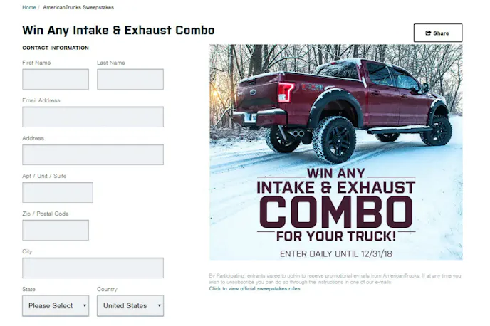 The giveaway is awarding one grand prize winner a boatload of credit to use in store–$2,000, to be exact. The money can be spent on any exhaust parts and accessories for all four of the major American late-model trucks, including the F-150, Silverado and Sierra, and 1500.