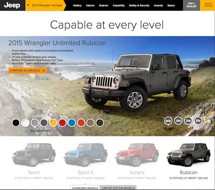 The new Jeep Configurator also covers every vehicle in the brand, so if you’re not all that thrilled with the all-new 2015 Renegade, then you can build your very own Compass, Cherokee, Grand Cherokee, Patriot, Wrangler, or Wrangler Unlimited, using the Jeep Configurator website. The site even offers videos, so you can see the vehicle you are considering in action. When you’re done building your own Jeep, the Configurator will also lead you to your nearest dealer.