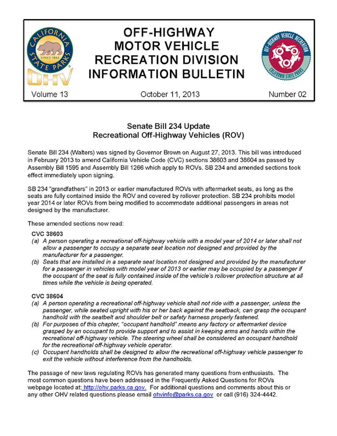 In February 2013 a bill was introduced to the California State Senate to amend the state vehicle code. These amendments were geared toward Recreational Off-Highway Vehicles (ROV/side-by-sides). California SB 234 was split into two portions; CVC 38603 and 38604.