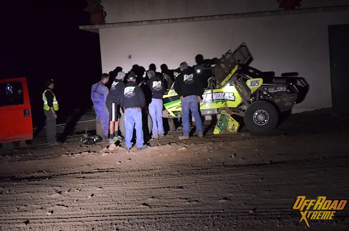 After the short drive, we found the vehicle pulled off to the side of the wash that leads racers out of the city. The crowd had almost surrounded the buggy and the other chase truck that was there. The panels came off just like they did the night before to, try and figure out what the problem was.