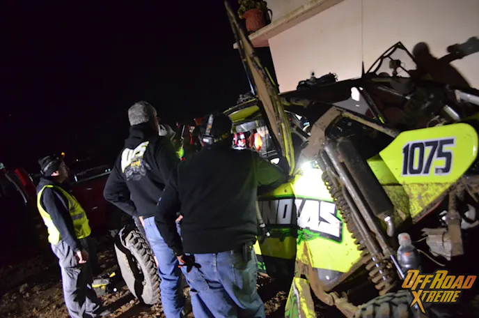 After the short drive, we found the vehicle pulled off to the side of the wash that leads racers out of the city. The crowd had almost surrounded the buggy and the other chase truck that was there. The panels came off just like they did the night before to, try and figure out what the problem was.