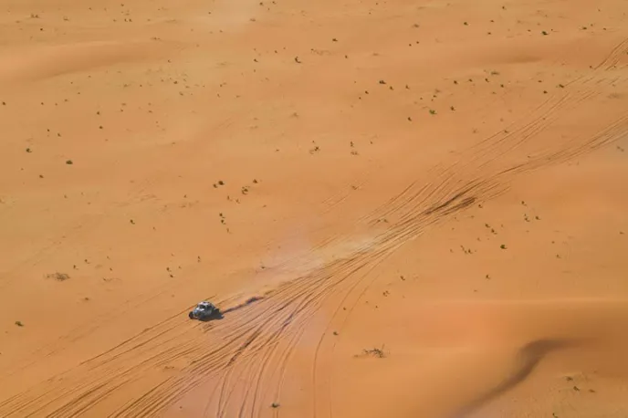 In the middle of the desert! The route for stage 6 gave the riders, drivers, and crews an uninterrupted taste of sand. No villages and not even a river, just plenty of camels from the start in Ha’il, in a splendid off-piste environment with dunes of reasonable size.