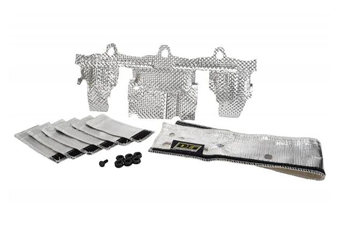 The kit includes: 1 manifold heat shield, 1 fuel rail heat cover, 6 fuel injector covers and 12 fuel injector OE replacement O-rings. Both the heat shield and the fuel injector covers are made of high-temperature rated glass fiber material bonded to a heat reflective aluminized material. The fuel injector heat covers can be used for either stock or aftermarket fuel injectors. Easy to install, the injector covers feature a split design and sewn-in hook and loop fastening edge that takes only moments to install.