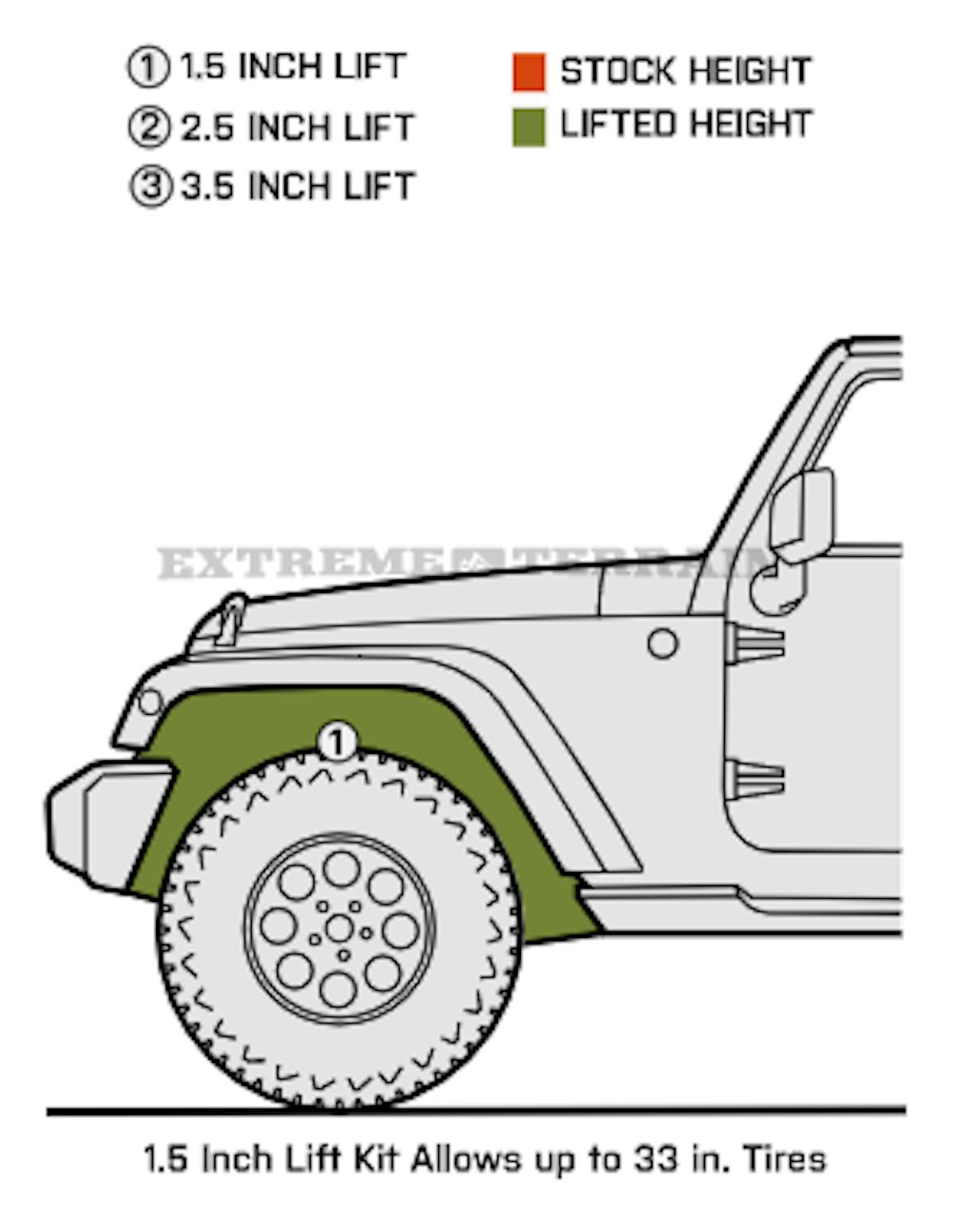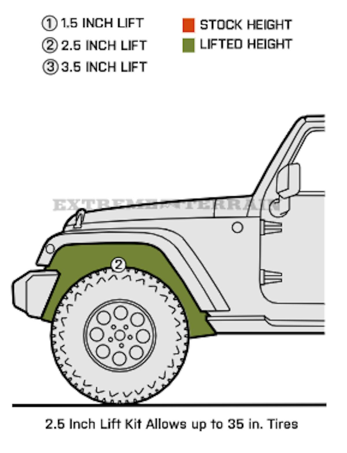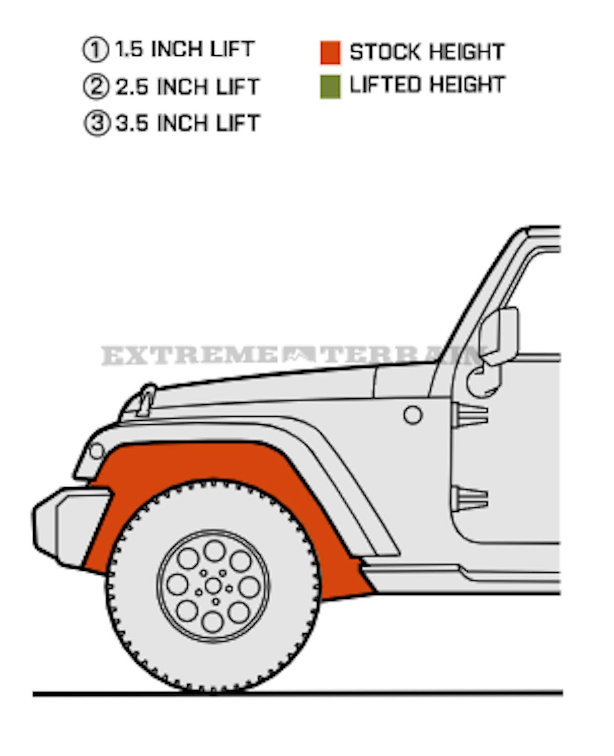 Simply put, the typical purpose of a lift is to gain clearance for larger tires, followed closely by better performance and ride. Each of the models of the Wrangler are a bit different on lift height requirements for common tire heights. The fenders and fender flares play a substantial role in what fits and doesn’t fit.