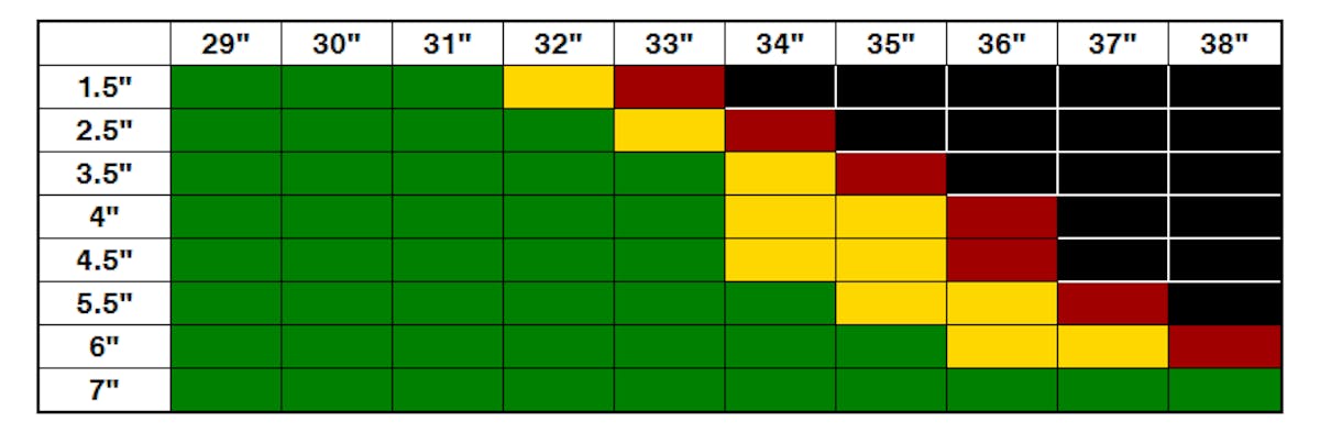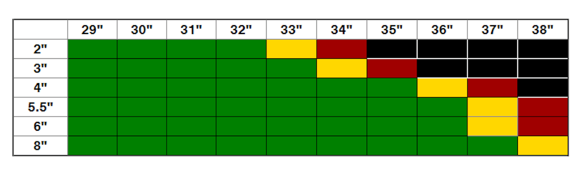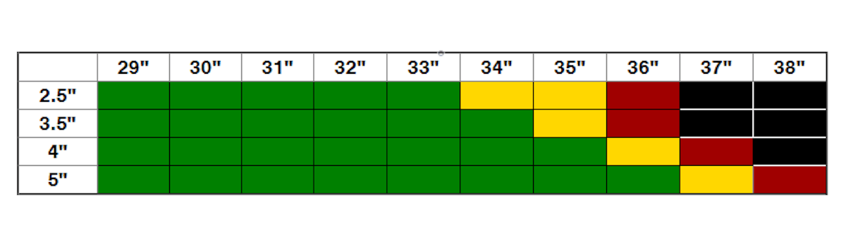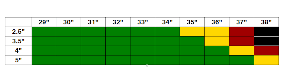 The above quick reference guides will help determine the lift and tire height requirements for your build. Green cells show no modifications required. Yellow cells show flare modifications needed. Red cells show extensive fender flare modifications needed and black cells are not recommended unless you are comfortable with extensive custom fabrication.