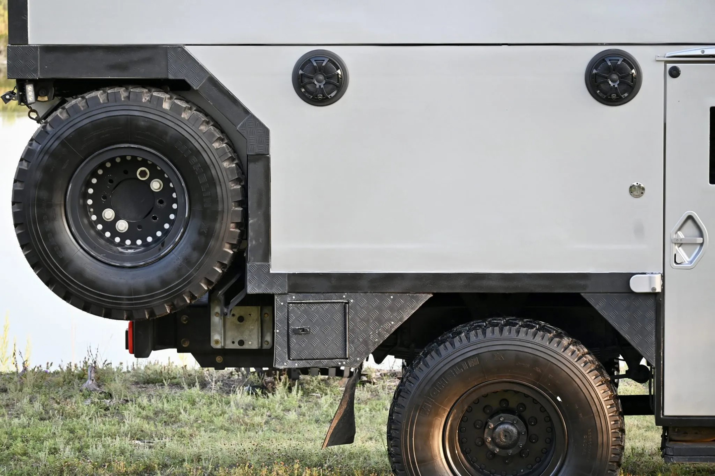 Other exterior features include a cab-mounted cargo rack, high-mount driving lights, and full perimeter lighting. Additionally, camp-side audio speakers and underbody equipment compartments. Finally, the truck rolls on 395/85R20 (over 46-inch) Michelin X tires, and there’s a pair of spares located at the rear of the truck.