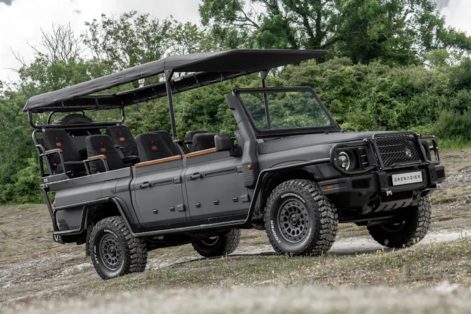 Ineos Kavango is a Botswana-based company, and it converted a Quartermaster pickup to the Safari game-viewer prototype you see here. Ineos says the company creates extensive modifications for the conservation, safari, anti-poaching, veterinary, primary healthcare, and film production sectors. The Safari has three tiered rows of eight seats to allow clear visibility for passengers. Additionally, the vehicle has custom exterior protection bars, bespoke 17-inch alloy wheels, and 315/70R17 (34.57-inch-diameter) Cooper STT Pro tires.