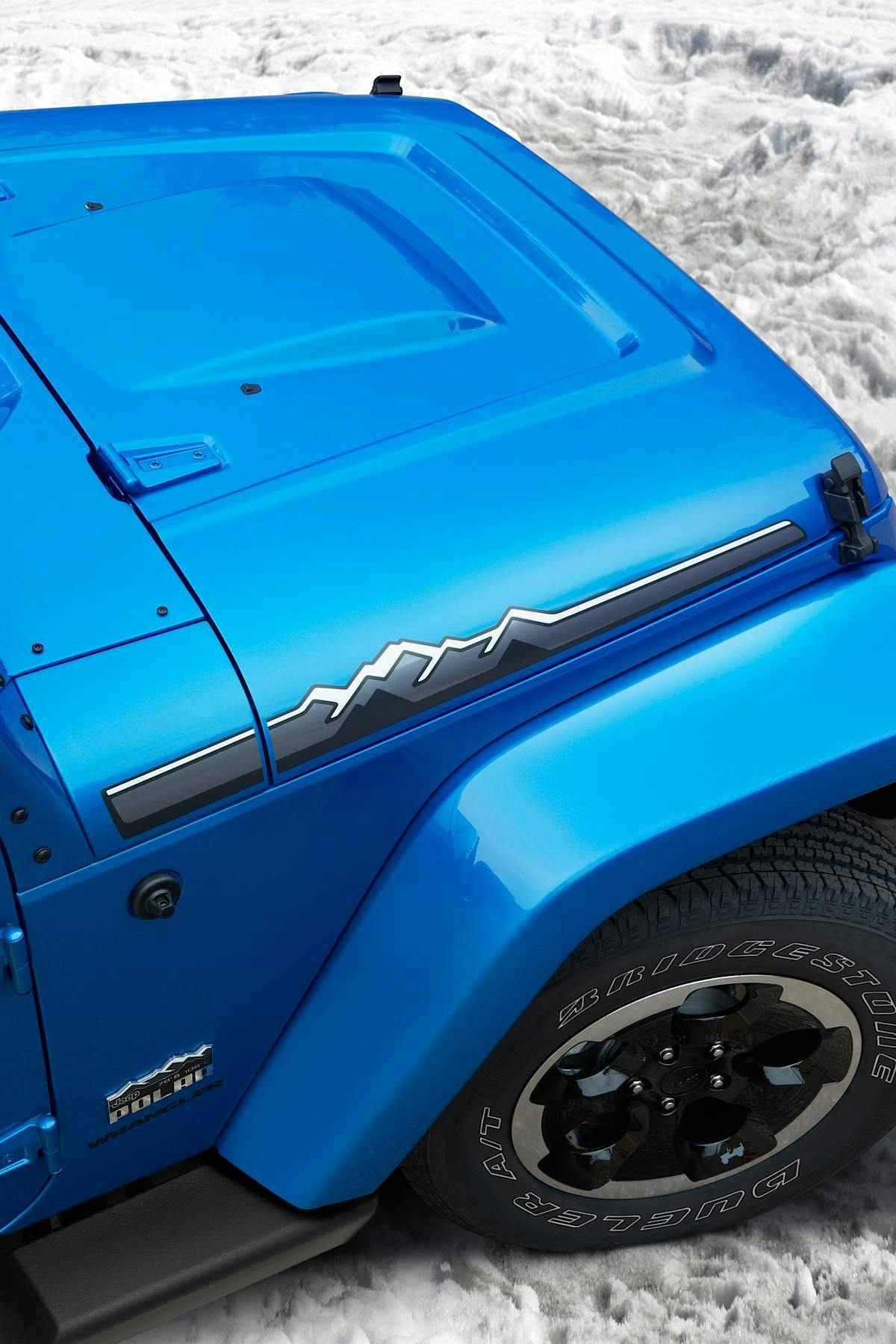 Exterior features of the new Wrangler Polar Edition are a new front grille, Powerdome hood and the body-color hardtop with deep-tint sunscreen glass. A gloss black Jeep logo above the front grille, and gloss black 18-inch alloy wheels enhance the look of the vehicle. A unique, three-color hood decal, featuring the outline of mountains, and the black fuel-filler door from Mopar completes the exterior decor.