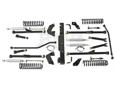 The long travel suspension kits clear room for larger tires, 35 to 39-inch tires depending on height and fender choice. The kits increase suspension travel, correct suspension geometry over a lifted short arm system, and improve the ride and handling.