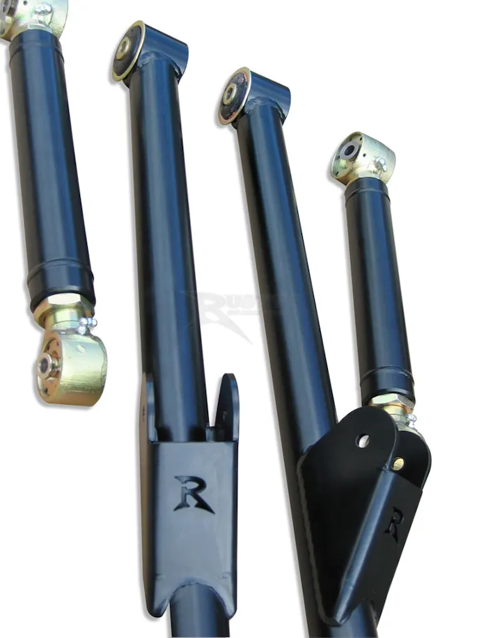 The radius-arm style corrects suspension geometry and increases suspension articulation on these kits. They also come standard with Flex Joints for maximum articulation, HD adjustable track bars included as standard equipment, and no failure-prone drop brackets. The arms are constructed of 0.188-wall DOM tubing and there is a wide range of shock choices including twin-tube, monotube, and remote reservoir.