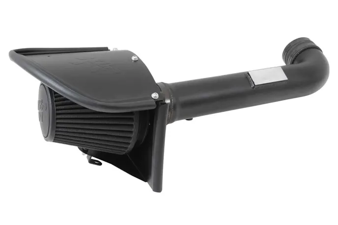 The mandrel bent aluminum intake tube is finished in a durable flat black powder coat for a bold look under the hood. In stark contrast to the black intake tube is a welded and engraved aluminum K&N nameplate. This Blackhawk Induction air intake system incorporates a black powder coated heat shield, also stamped with the K&N logo, to help deflect engine heat away from air entering the engine.