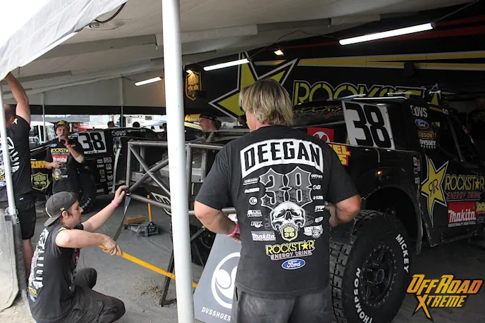 Looking to the left, the displays for 4 Wheel Parts, Lucas Oil, Jeremy McGrath, Brian Deegan, and Rob MacCachren are fully up and running. Look to the right, and the tents of Rockstar Energy, Toyo Tires, General Tire, Mickey Thompson Tires, BF Goodrich Tires, and Maxxis Tires stretch the length of the entrance all the way to the stands.