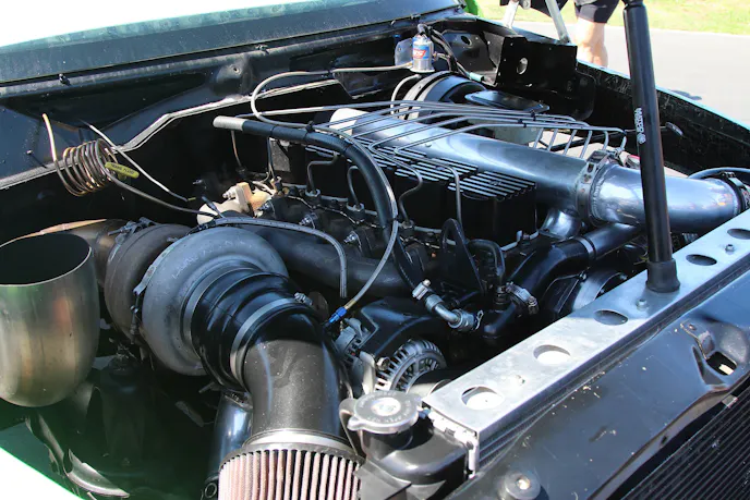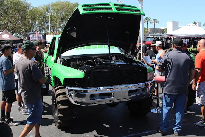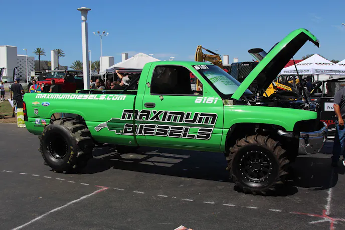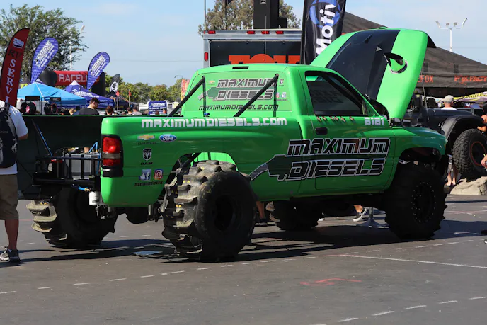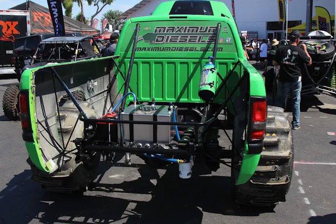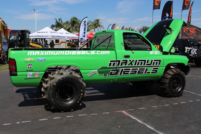 The power plant is a 5.9-liter Cummins. It spits out power like a bitter bite of arugula. The current horsepower output number for the truck is between 1,200 to 1,500 horsepower. Jake and the crew run a two-stage nitrous setup and a 75mm turbo. The internals were sourced from Hamilton, as well as Diesel Injection and installed by Jake and the Maximum Diesels crew at their shop. ARP head studs are utilized to keep things together. BD Diesel converter and shifters transfer all of that power to the paddle tires.