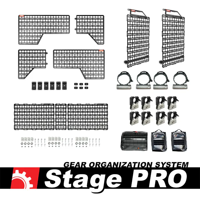 The GMC/Chevrolet 1500 Gear Organization System Stage PRO Kit is a comprehensive kit that includes a full set of Bedside Rack System MOLLE panels and a pair of Rigid Seat Back MOLLE Panels, complete with essential attachments. Moreover, it includes Original Riser Mounts that are specifically designed for mounting two implements. Additionally, there are Super Clamp Riser Mounts. With the assistance of MOLLE nuts, installation and configuration are hassle-free. Finally, there are a pair of BuiltRight’s Cubby Pouches that take advantage of the rear seat cubby storage.
