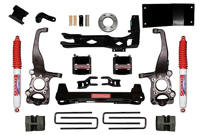Unwilling to compromise steering geometry both kits require 20” wheels and allow the use of 35” tires. The 6” lift kit can be used with 37” tires, but slight trimming of the inner fender plastic liner may be required. The new kits are specifically designed for models equipped with factory Electronic Stability Control on the F-150. All Skyjacker products come with a limited lifetime warranty. Add all these components together and you have the best performing, riding and most durable kit on the market that is easy to install.