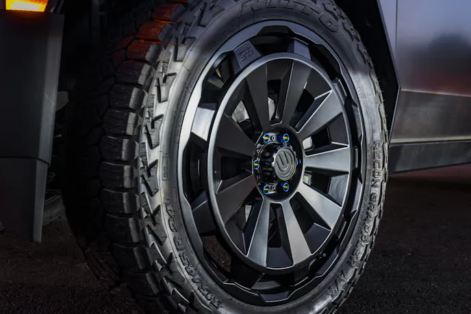 The CYBRNOVA’s design is anything but ordinary. Unplugged Performance drew inspiration from the explosive power of a supernova, creating a radially bolstered, nine-spoke pattern that echoes a star’s outward blast wave. A distinctive mid-spoke reinforcement ring not only adds to the cyber-inspired look but also braces each spoke under heavy loads. The wheel’s flat-faced profile provides an aerodynamic advantage that reduces turbulence at speed. Its multi-layered, straight-edged design language creates a cohesive look, making the wheel appear as though its designers crafted it right alongside the Cybertruck.