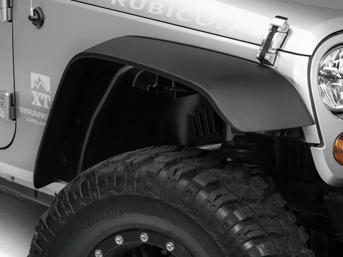 The RedRock 4×4 Flat Fender Flares (Sku #J104388) will be an upgrade from stock that will allow for larger tires to be installed without having to sacrifice the inner lining of your fender flares. This fender liner kit will protect against surface damage and possible rust caused from excess mud, dirt and debris build-up. Not only will these fender flares and liner protect your JK Wrangler from trail hazards, they will also complement your Wrangler’s factory matte black finishes.