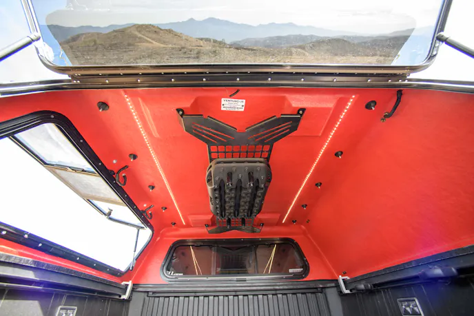 The Ozark is a cab-high topper, and its standard features include a custom-fit rear door skirt that matches the tailgate, a third brake light, and a high-end resin interior finish. Additionally, it comes with tinted glass and high-quality Axalta paint to match your truck’s color. The topper’s heavy-duty roof structure gains added strength from PET (Polyethylene Terephthalate) foam reinforcement. It is designed to support roof racks and rooftop tents, and it eliminates the chance of delamination. Options include interior lighting, a roof rack system, and a choice of trim finishes, which include either painted trim or a trimless edge.