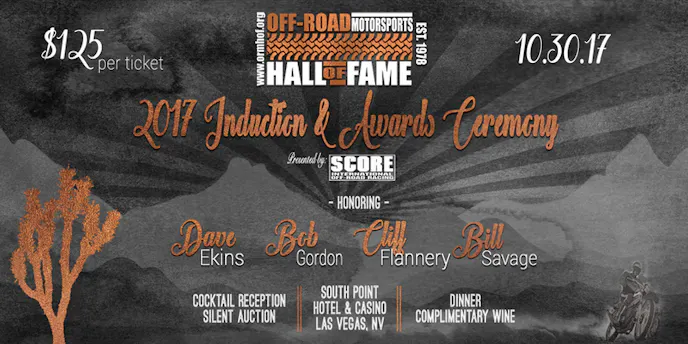 The Class of 2017 will be inducted at the Off-Road Motorsports Hall of Fame 2017 Induction & Awards Ceremony, presented by SCORE International, on Monday, October 30 at the South Point in Las Vegas.
