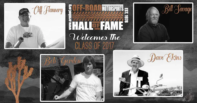 The Class of 2017 includes motorcycle racing pioneer Dave Ekins, who will join his brother Bud Ekins in the Hall of Fame. Crandon International Off-Road Raceway founder Cliff Flannery will also be inducted this year, joining his brother Jack Flannery in the Hall of Fame. Also being honored with membership in the Hall of Fame this year is desert racing legend Bob Gordon, and off-road innovator Bill Savage.