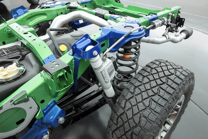 The Ram TRX is eight inches wider when compared to the rest of the Ram 1500 lineup, and the composite flares help to compensate for a six-inch increase in track width. To accommodate the Goodyear Territory tires that were designed exclusively for TRX, the truck’s front axle was moved 20 millimeters forward. Those 35-inch tires are available with 18-inch beadlock-ready wheels with accent color-matched rings.