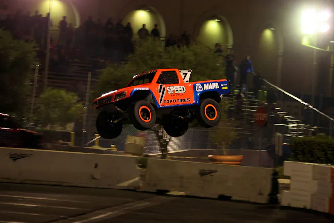 That fateful Friday night, on November the 8th, it was the three-way competition between Rob Mac, Robby Gordon, and P.J. Jones that had the crowd cheering and whooping as the three men battled it out over the course of 30 laps around the Caesar’s Palace estate. An early restart of the race–following mechanical failures on several trucks–gave an advantage to the three men after the herd was culled.
