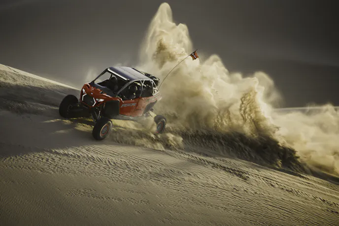 Beneath that screen beats the heart of the beast: a 225-horsepower ProStar Fury 2.0 four-cylinder engine that thrives in dunes and open desert. With a 74-inch stance, 104.5-inch wheelbase, and 29 inches of usable travel via the MaxLink suspension, the Pro R eats whoops for breakfast. DYNAMIX DV semi-active suspension constantly adapts to the terrain, giving riders precise control even at full throttle.