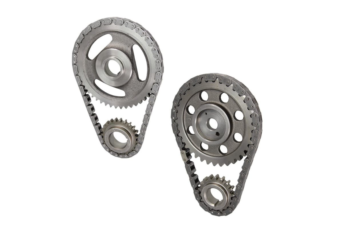 First up are the High Energy timing sets. COMP offers two versions of these sets – one meant for stock to mild performance on 1999-2006 engines (PN 3237) , and the other for heavy-duty performance on 1964-1998 engines (PN 3219). The 3237 set uses a precision cast iron camshaft gear, along with a steel crank sprocket and a durable link belt chain. The 3219 set uses a wider link belt chain for less stretch, and the tooth design on both the sprocket and gear is stronger as well.