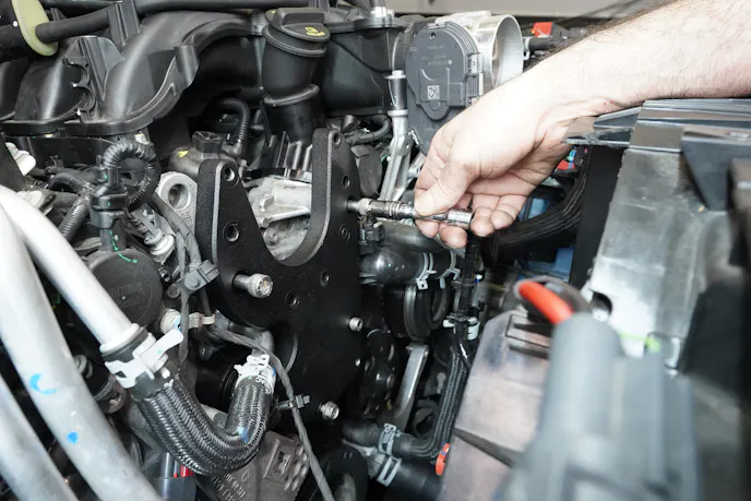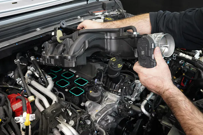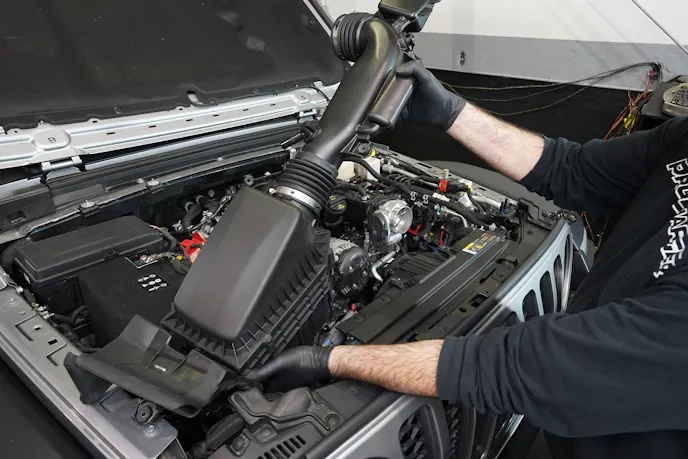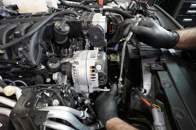 The installations starts with disconnecting the negative battery terminal. “Since we are moving the location of the alternator, and it’s directly connected to the battery, if the customer doesn’t disconnect the battery, they will be in for a shock,” said Radzins. Once that’s done, a number of parts have to be disconnected or removed. These include the engine cover, PCV line, IAT sensor, and air inlet tube. After this, the alternator and its bracket come out, along with the serpentine belt, and then the grille.