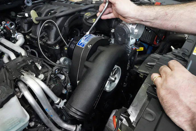After routing a provided serpentine belt around the pulleys, users can now mount the supercharger bracket and supercharger in place. ProCharger includes a bottle of supercharger oil to pour in once the blower is installed. The tensioner is compressed again to slip the belt on, and now, the installation is on the home stretch.