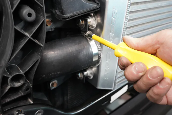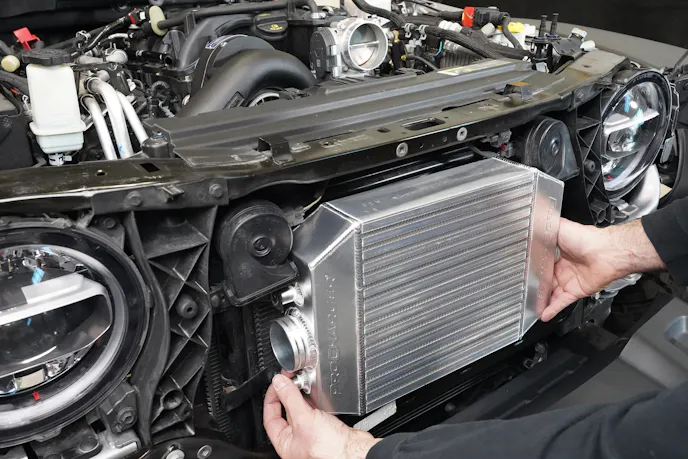After rewiring the alternator with provided wire, the intercooler and surge system is installed. The radiator is adjusted slightly to give enough space for the intercooler. Provided tubes and clamps will route air from the supercharger to the intercooler and into the throttle body. The IAT sensor is reinstalled into a tube.
