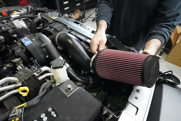 The surge system and PCV systems come next, and finally, the new air inlet. An elbow tube angles down to give space for the filter and clearance with the hood. The entire system is now complete and ready for tuning and testing. “We include a tuner in the full system, which is also EO CARB compliant,” said Radzins. “Tuner kits do not include the fuel system parts or the handheld. This is so a tuner shop can do that aspect of the install if they wish.”