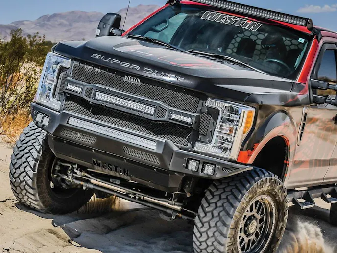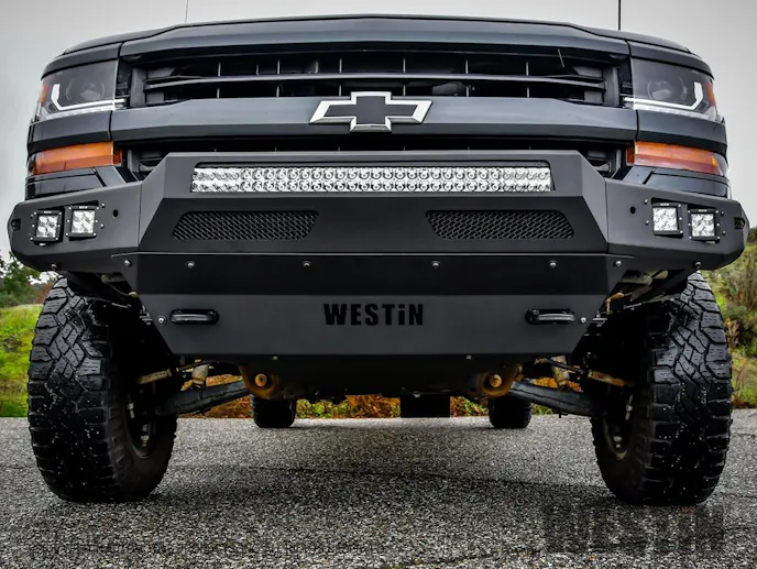 Looks can be a major factor in choosing any body component and the Pro-Mod Bumper delivers here as well. Mesh screens add aggressive styling cues and deliver additional airflow. Because the screens are removable, you also have the option to customize your bumper with a selection of Westin LED Lights. On the subject of lights, all models can also accept 30-inch LED light bars as well. Next, to maximize corrosion resistance in the harshest of environments, all models receive an E-coating base coat. Finally, each is finished with a textured black powder coating topcoat and laser-cut Westin logo to complete that custom look.