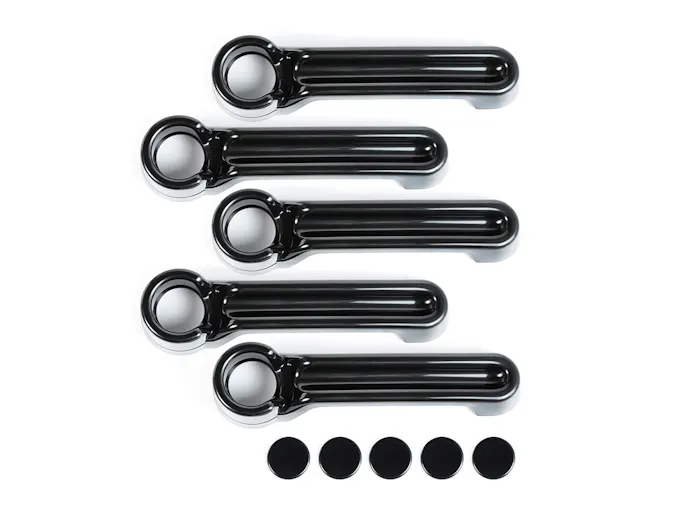 Constructed of sturdy ABS plastic, Rugged Ridge Exterior Trim Covers have a smooth black finish, or can be painted any color to match the color of the vehicle. Paintable trim covers are available for JK mirrors, mirror arms, door handles and liftgate hinges for a combination to suit any taste. Each Trim Cover installs with the included automotive-grade adhesive backing for a secure fitment.