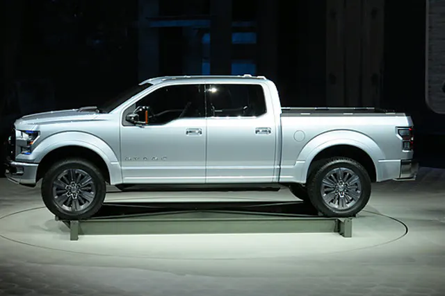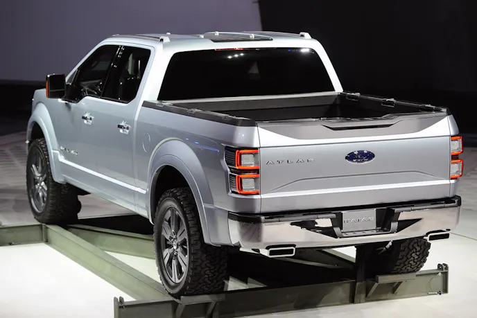 It’s said that the 2015 F-150 drops more than 550 pounds, the light-metal body contributing about 450 pounds to the total reduction. It’s reported that Ford will strive to get the base regular-cab 2WD pickup’s highway EPA fuel mileage toward 30 MPG. Current CAFE standards require full-size pickups to average 30.2 mpg by 2025. The Atlas concept truck was obviously the design direction for the 2015 F-150, and included innovative and aerodynamic, fuel-saving devices such as active grille shutters, active wheel shutters, and a deployable front air dam, which are said to be included on the new pickup.