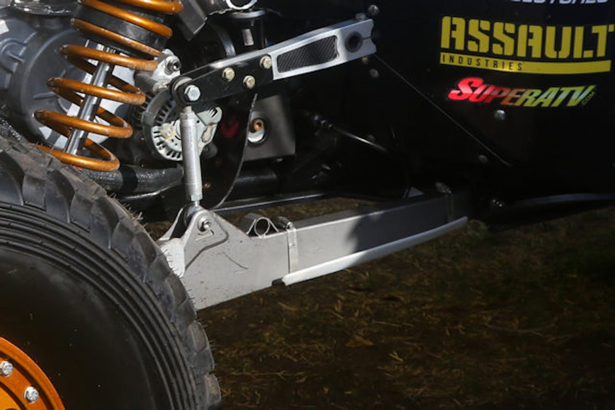 The front suspension includes more damping control from Fox Shocks. The beefy upper and lower suspension arms are made by Madigan Motorsports. SuperATV Rhino 2.0 axles drive the wheels.
