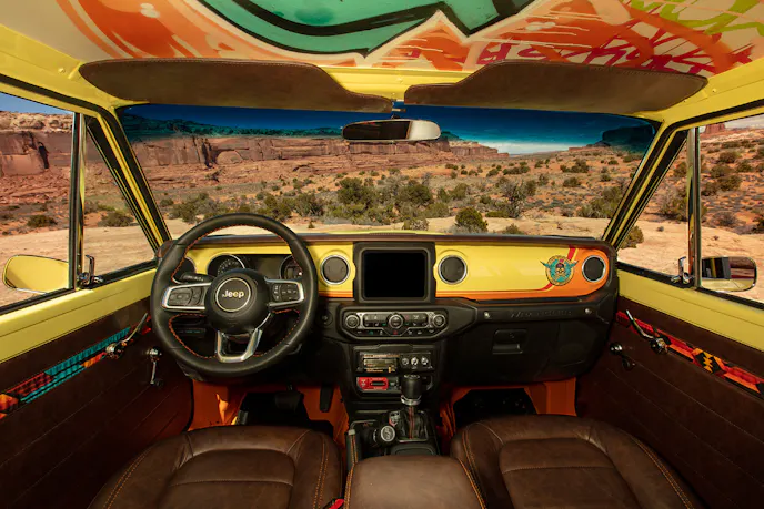 The Jeep ’78 Jeep Cherokee 4xe concept’s custom interior features low-back bucket seats trimmed in leather. The rear bench seat was replaced with a four-point safety cage, and the rear cargo space houses a full-size spare tire just in case the trail gets a little too wild.