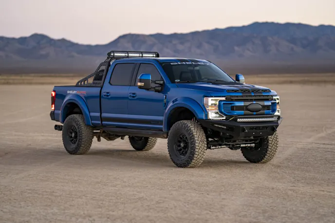 That is more than enough to kick you back into your custom Shelby leather seats, which flaunt the company’s logo in contrasting red stitching. The interior also gets a generous serving of carbon fiber bits, billet racing pedals, and stainless steel gauges. The truck now rides on a bespoke suspension setup which was designed in collaboration with FOX. The new system uses a FOX 2.0 dual steering stabilizer, a custom BDS lift system, front radius arms, and front coilover springs, which come equipped with Fox 2.5 adjustable reservoirs.