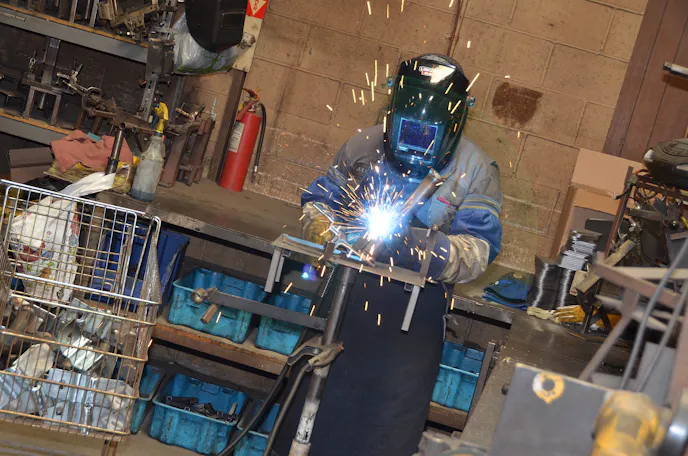 Left to right: the shop production area, equipped with metal cutters; a welder mig-welding an Adventure Rack support brace; the powder coating booth.