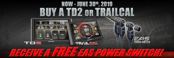 Between now and June 30, you can order a TrailDash 2 or TrailCal and receive a free EAS kit. The EAS kit works with all of those electronic mods that you need access to – lights, winches, electronic lockers, and more. And the kit works with a TrailDash 2 or TrailCal seamlessly, using the display to show switches that turn on and off the electronics.