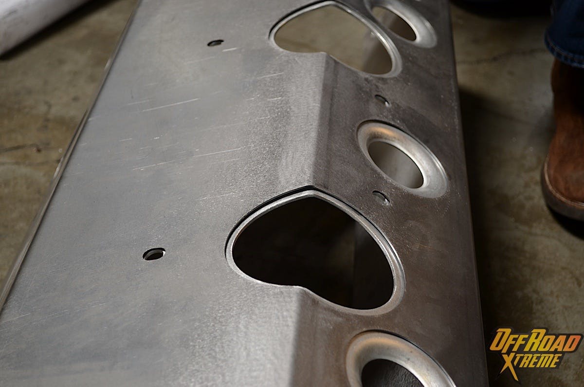 The MC2X Jeep front bumper uses 6061 T6 aluminum alloy with a tough outer skin of 4130 chromoly steel to make the bumper lighter, but tremendously stronger. They had the bumper skin there available for us to pick up, and it surely shocked us. The large piece of metal was the size of something you would think with two hands you could barely pick up, but instead we were able to lift it with two fingers.