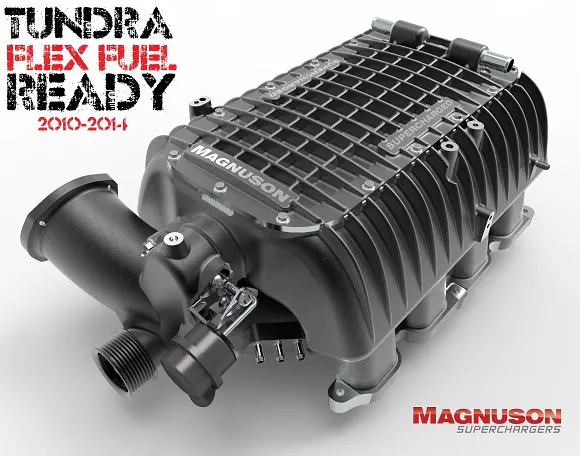 Now available is the Tundra Supercharger System for 2007-2016 Toyota Tundras with the 5.7L V8. The system has an OEM style and look, single large charger air cooler, larger plenum and tapered runners. While running at 7psi , the system pushes the import V8 to 550 horsepower and 550 pound-feet of torque. CARB certification is in process and the system is Flex Fuel Ready.