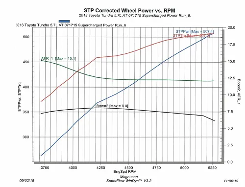 The Tundra supercharger uses Magnuson’s adaptation of the Eaton Twin Vortices Series (TVS) supercharger unit. The unit is designed for positive displacement and internally uses a roots style pump and Eaton’s lightweight four-lobe 160 degree twisted rotors. With this design, the supercharger does not compress air as it moves through the rotors. Because of this, light throttle and cruising are far more efficient. The TVS units have a bypass system for unwanted internal air which reduces parasitic loss and bumps up the economy.