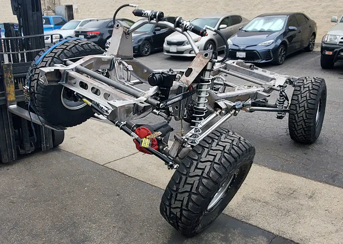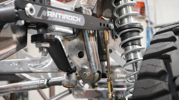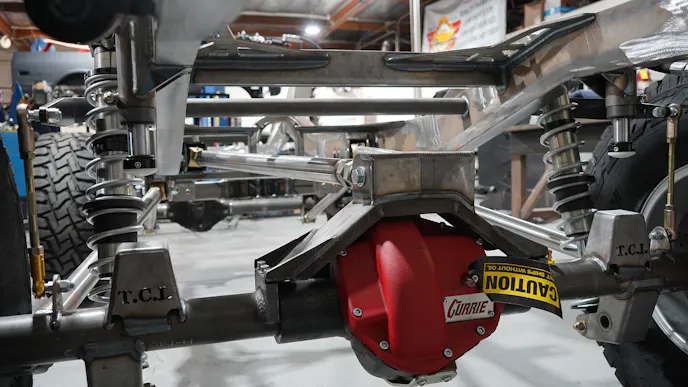 The chassis uses a four-link suspension, and the angle of each Fox coilover is close to vertical, which keeps motion control close to 1:1. The TCI team mounts the remote-reservoir coilovers as wide as possible for utmost roll control. Additionally, the link bars have a maximized length that deliver minimum wheelbase change throughout wheel travel, and they limit roll steer. The links are fitted with RockJock Johnny Joints. Other suspension components include Fox Race Series bumpstops and RockJock Antirock sway bars. TCI says that the suspension allows for 12 inches of wheel travel at each corner.