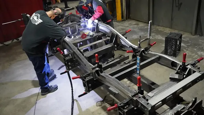 The team places the frame in a chassis fixture and adds the front and rear crossmembers, along with a new design centersection. The result is reliable fitment and tight tolerances. This translates to no drama when bolting on things like the core support, body tub, and bumpers. If you compare a stock K5 chassis to TCI’s chassis, you’ll see wider framerails ahead of the cab. This is to allow more room for engine headers and steering components. Out back, the chassis is narrower than stock. This allows the rear coilovers to be mounted outside the framerails to help maximize roll stiffness. The chassis can fit up to 37×12-inch tires.