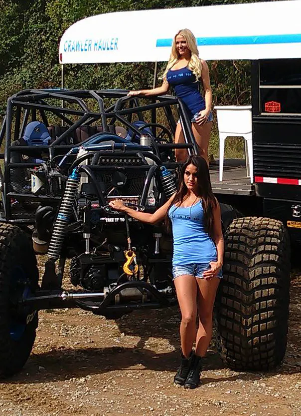 The girls posing with the vehicles are Tennessee Titan Cheerleaders. Tandra is the blonde and Stephanie is the brunette pictured here. Among the vehicles featured in the calendar are a monster buggy on 54-inch tires and Rockwell axles called Mad Max.