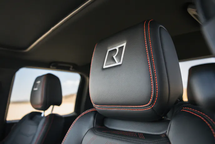 The upgrades don’t stop with the suspension. The PRO-4X R rolls out on 265/70R17 Hankook Dynapro AT2 Xtreme tires wrapped around 17-inch off-road wheels finished in titanium and stamped with Roush’s “R” logo. A titanium-painted skid plate and grille inserts add both protection and style, while Lava Red tow hooks stand out as functional trail-ready accents. New badging on the grille, tailgate, and fenders gives the Frontier PRO-4X R a look that’s unmistakably Roush. Inside, the cabin carries the same theme with custom-embroidered seats that bring a bit of performance flair to the interior. The result is a truck that looks as serious as it performs.