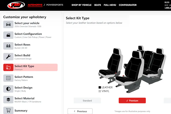 To explore available configurations for your truck, SUV, or Jeep, visit TMIProducts.com/upholstery and check your specific seat setup.