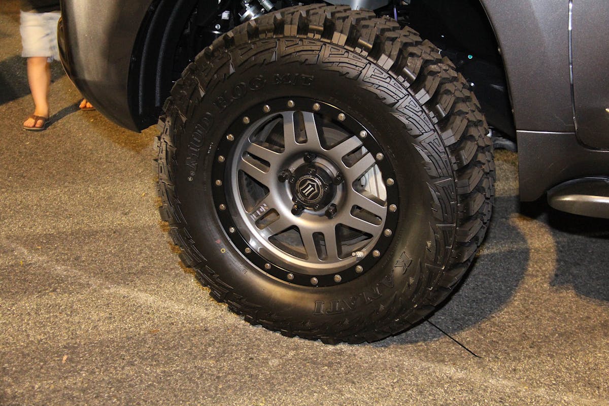 This next tire is toned down quite a bit compared to the first, as it completely lacks any wild color. Starting from the center are some ICON Six Speed wheels finished in dark grey Gunmetal color. The split six-spoke design has become very popular in the last five years, and it really looks good on pretty much any vehicle. Wrapped around those wheels are Kanati Mud Hog tires which have a very aggressive side wall and really compliment the wheels nicely.